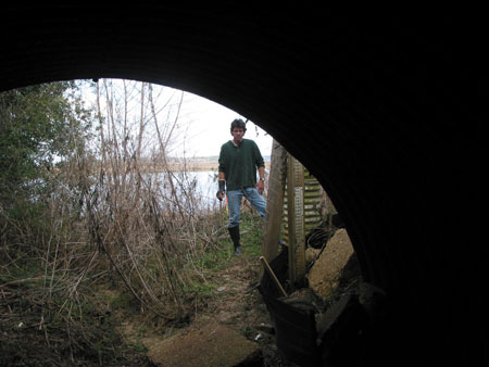 Matt Aresco standing outside the east entrance to the 12' diameter culvert. The photo is taken from inside the culvert looking east towards Lake Jackson.