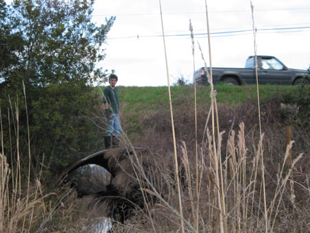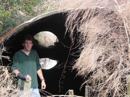 Matt Aresco standing on top of the west entrance to the 12' diameter culvert. The photo is taken from the Little Lake Jackson side of the highway looking towards Lake Jackson. A truck traveling along US 27 can be seen in the upper right.