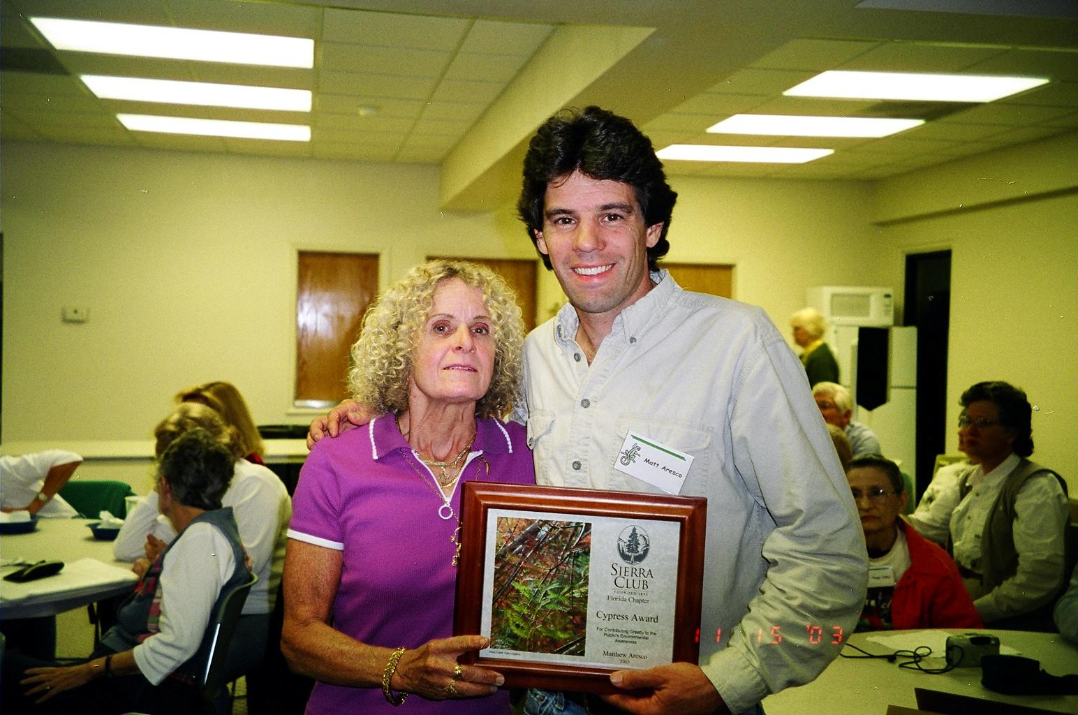 Sierra Club of Florida representative Linda Jamison presenting Matt Aresco with