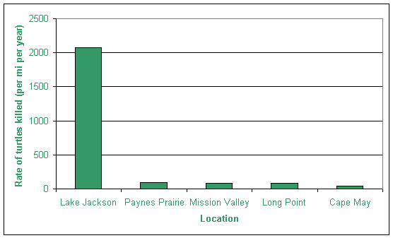 See also our traffic mortality web page where we show that a turtle now has a 98.86% chance of dying if it enters on to US Highway 27 at Lake Jackson.